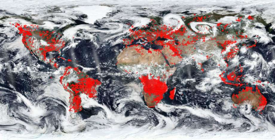At one point in July the whole Northern Hemisphere seemed ablaze. It may be the first transcontinental fire ever seen. Fires rages in most of western North America, in the Arctic, in Sweden, Germany, Greece, Russia, Japan, and even Australia – where it is supposed to be winter. A global fire-mapping service just blaring red all over. Meanwhile in Africa the annual crop-burning, and in the Amazon and Indonesia, slash and burn to expand agriculture added to the planetary pulse of carbon into the atmosphere. It as all in the same two weeks of July. Here is a graphic by NASA based on fires they can see from space.