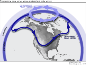 Previously we thought all weather happens in the Troposphere, while the Stratosphere was relatively calm and stable.  But the separation between the weather layer and the stratosphere is not complete. We know that certain energy events in the Troposphere can influence stratospheric winds. But our interest here is the other way around. How do variations in the Stratospheric Polar Vortex change our weather? Is this why large regions can be hit with a severe cold-air outbreak even as the world warms? We are seeing warmer and warmer winters. Each year competes for the warmest winter ever recorded. Then strangely, Arctic air events arrive in the south.