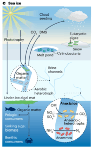 About a quarter to a half of organic carbon stored on land is in the Cryosphere, held there like a cold locker. Surprisingly, the authors find there is a richer microbial life on sea ice than in surrounding water!
